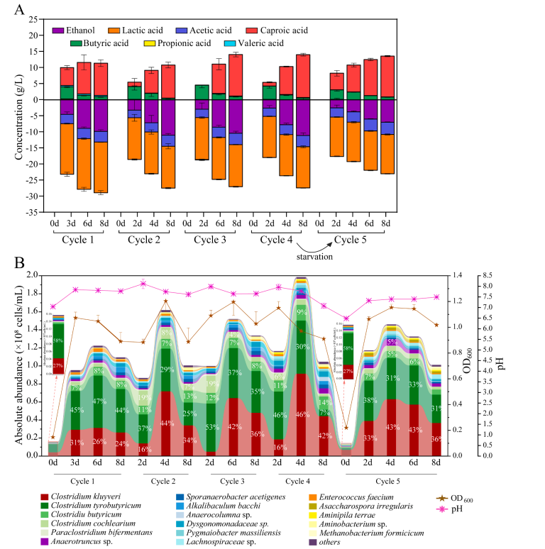 连续发酵表明,乳酸和乙醇始终保持被高度利用,且己酸产率和选择性都保持较高的水平。接着对发酵过程中菌群表征,在每个发酵周期中,C. kluyveri和C. tyrobutyricum始终是最主要的两个物种,且Anaerotruncus sp.等也持续出现在每个发酵过程中,表明其潜在的相互作用。