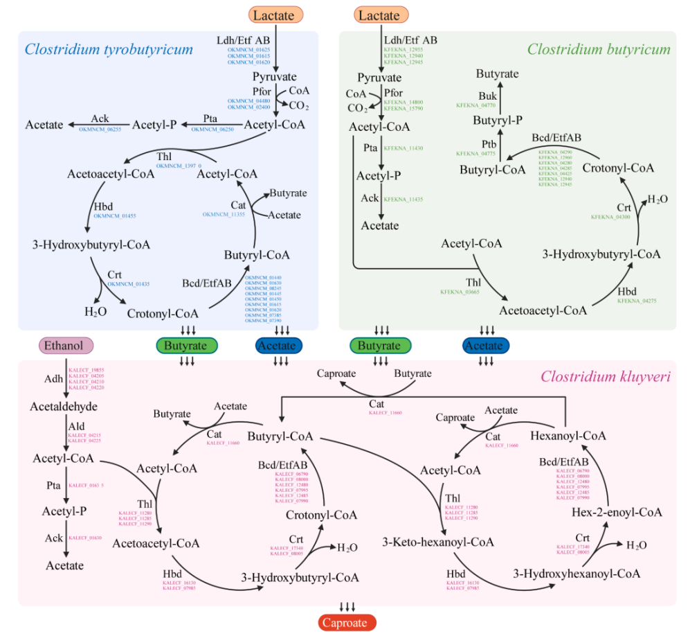 基于稀疏相关性的网络分析表明,C. kluyveri与C. butyricum和Muricomes intestini呈正相关,这可能与它依赖丁酸作为己酸合成的电子受体有关。重建C. tyrobutyricum,C. butyricum,C. kluyveri的代谢途径,表明C. tyrobutyricum和C. butyricum都能通过电子传递黄蛋白依赖的乳酸脱氢酶和EMP途径的后续酶将乳酸转化为乙酰-CoA,通过反向β氧化协同将乳酸和乙醇转化为己酸,且乳酸的脱羧抵消了乙醇驱动的己酸合成引起的酸化,从而实现了自我调节的pH值稳定性。