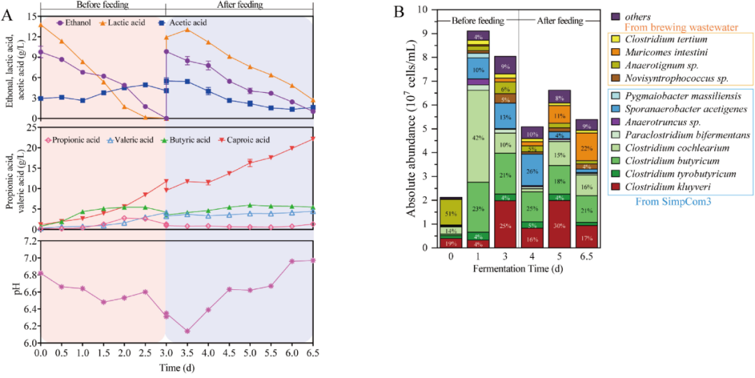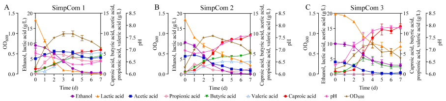 分批发酵和补料分批发酵实验均表明,C. kluyveri 有效地启动了己酸生产,且伴随着Muricomes intestini 和 Anaerotignum sp. 生长。非核心物种没有对SimpCom3将乳酸和乙醇转化为己酸的能力产生负面影响。相反,这些非核心物种可能在将废水中的其他营养物质转化为乙酸和丁酸的过程中发挥积极作用。