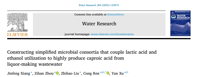 Xiang J, Zhou Z, Liu Z, Ren C, Xu Y. Constructing simplified microbial consortia that couple lactic acid and ethanol utilization to highly produce caproic acid from liquor-making wastewater. Water Res. 2025 Jun 7;284:123973. doi: 10.1016/j.watres.2025.123973.