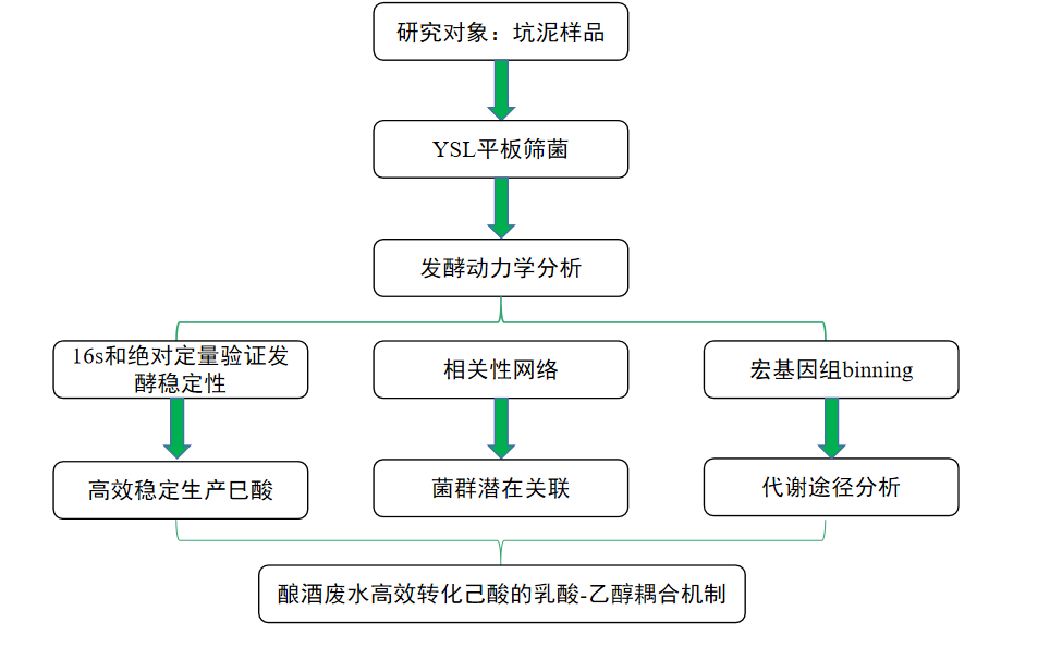 **实验设计:**以坑泥样品为来源筛选降解乳酸和乙醇的菌株,将菌株混合后收集发酵液表征含量变化,接着通过一系列的发酵稳定性和废水验证实验,结合多组学技术,揭示菌群协同配合生产己酸的机制。