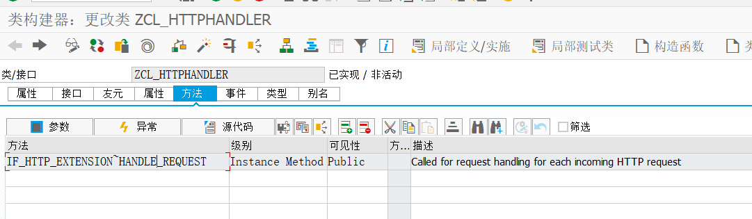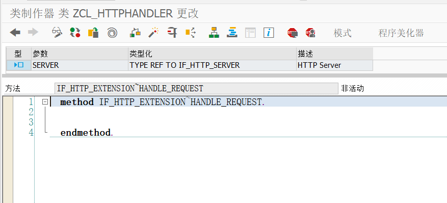 进入方法编辑 :切换至"方法"标签页,系统会自动生成方法IF_HTTP_EXTENSION~HANDLE_REQUEST,双击该方法名称,进入代码编辑界面。