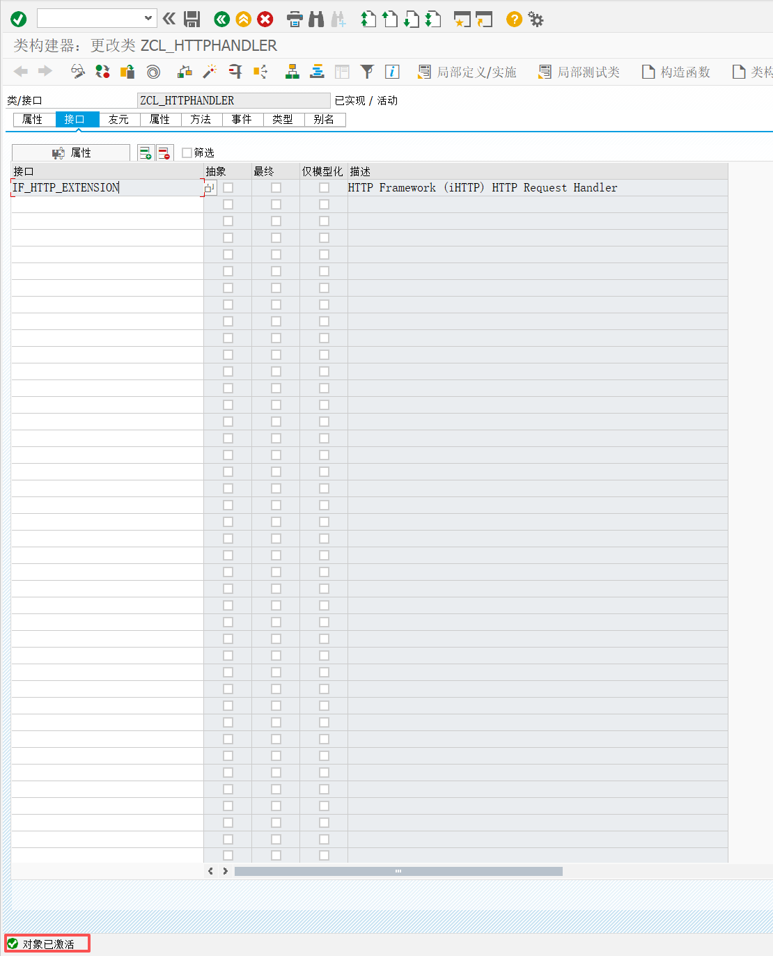 关键点:IF_HTTP_EXTENSION接口是SAP HTTP处理器必须实现的接口,它包含handle_request方法,用于处理所有HTTP请求。