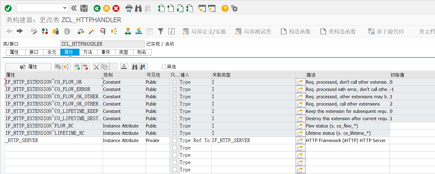 定义属性 :切换至"属性"标签页,添加属性IF_HTTP_SERVER,类型设为REF TO IF_HTTP_SERVER,可见性设为"受保护"。