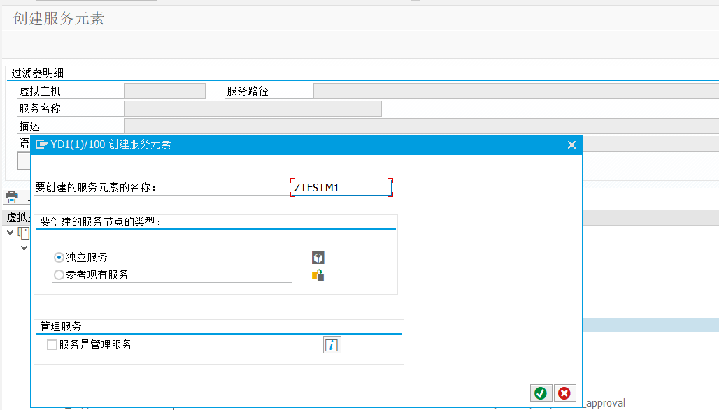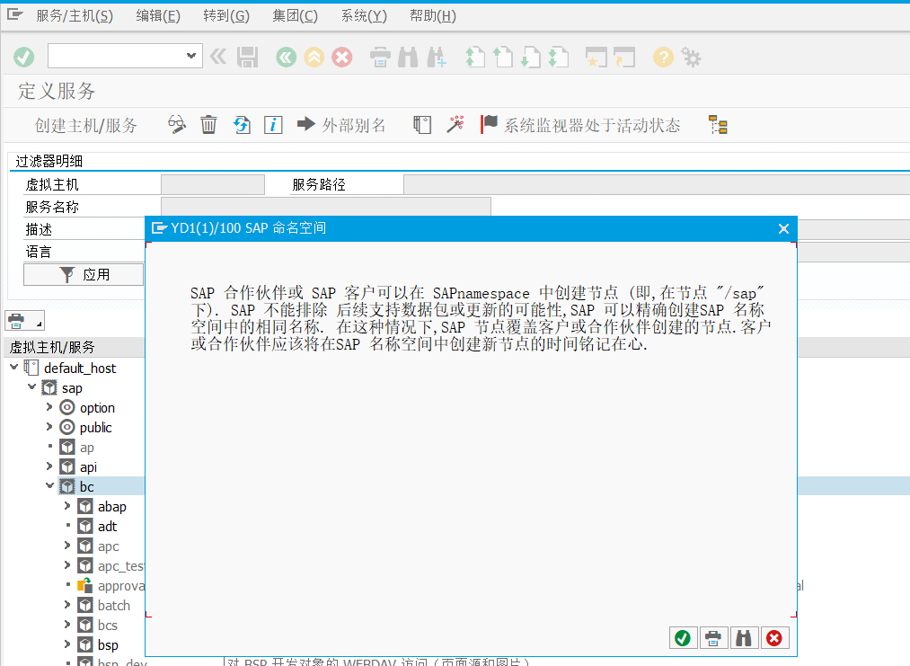 创建服务 :弹出SAP命名空间提示框,直接点击"确定",输入服务名称(示例:ZTESTM1),选择"独立服务"类型,点击"确定"。
