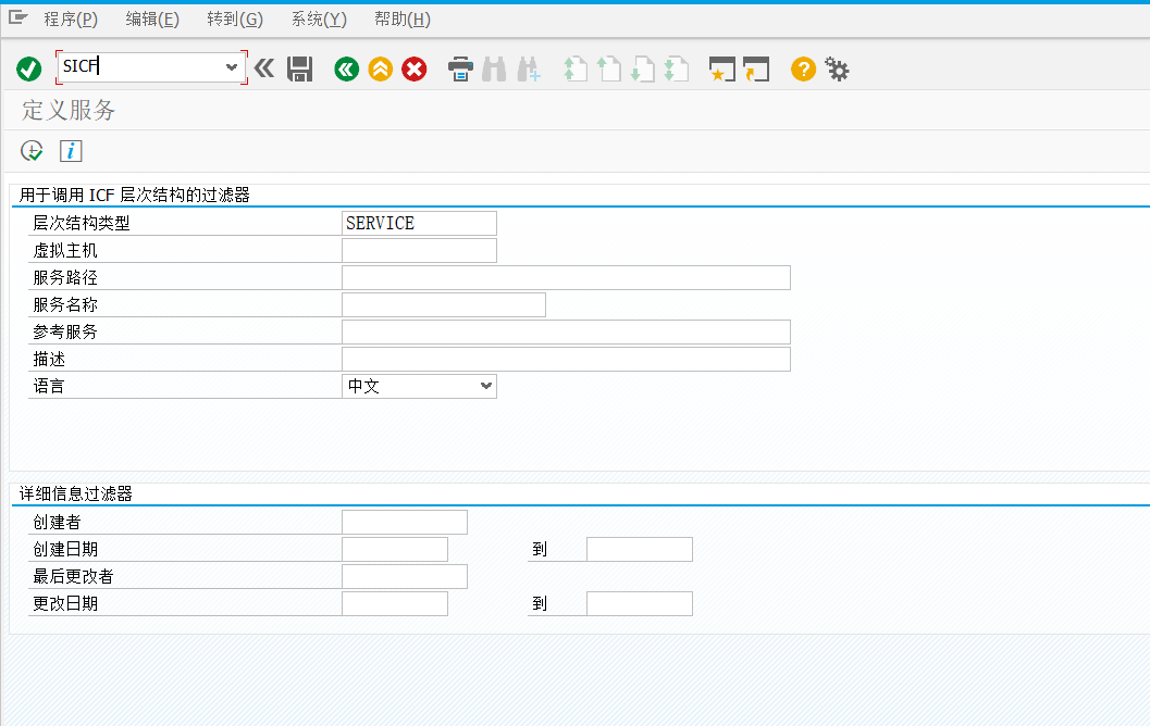 启动SICF :输入TCode SICF,进入"定义服务"界面,按屏幕提示填写筛选条件(语言默认选择English),点击"执行"。