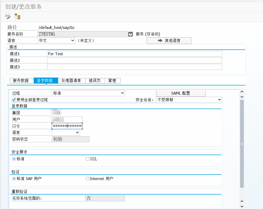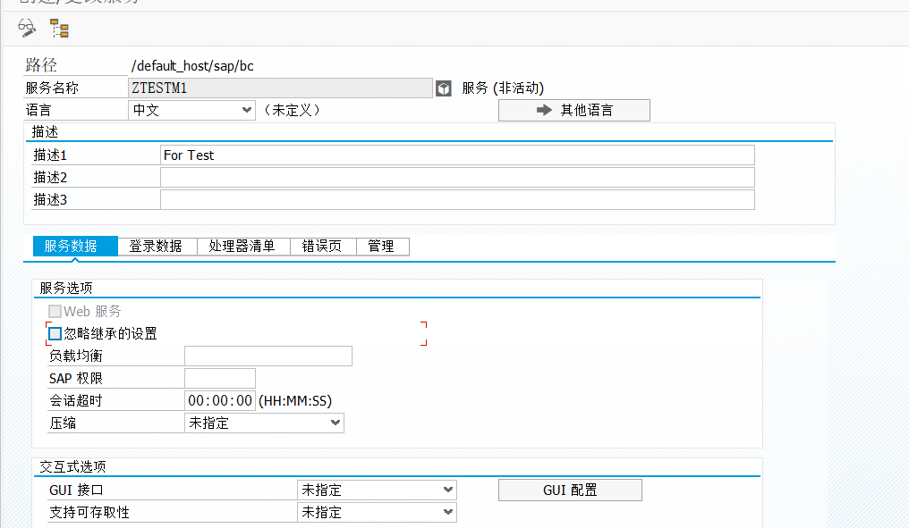 配置服务数据 :进入服务配置界面,切换至"服务数据"标签页,填写描述(示例:For Test),其他保持默认。