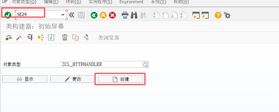 启动SE24 :输入TCode SE24 ,进入类构建器,输入类名称ZCL_HTTPHANDLER,点击"创建"。