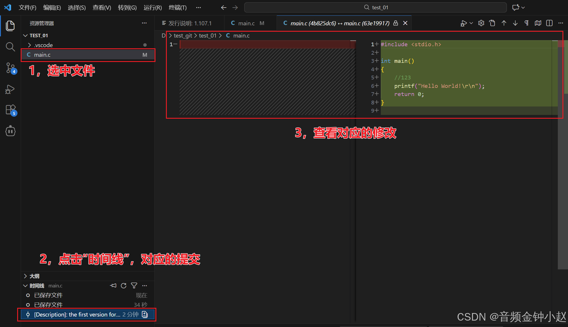 把带有.git管理的工程拖入VScode,按照如下操作步骤查看对应的修改: