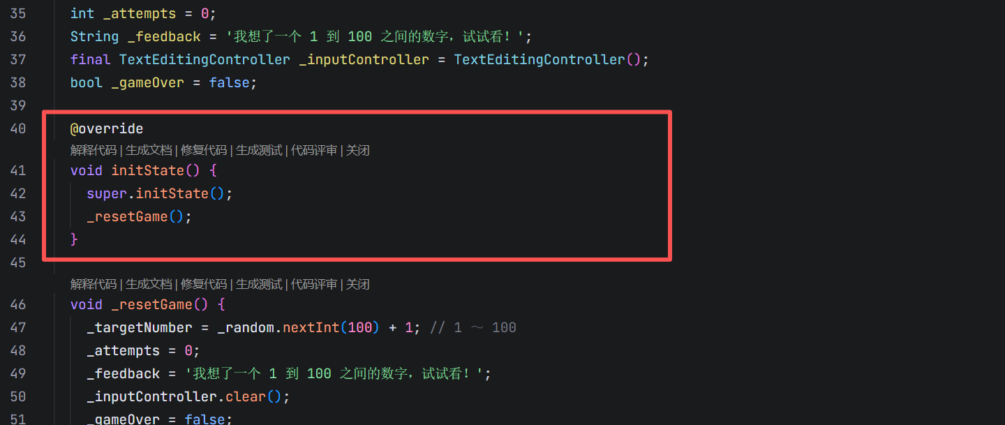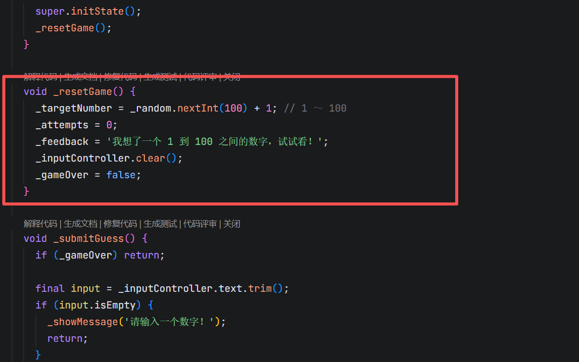 良好的代码应避免重复。我们将游戏初始化与重置逻辑封装在 _resetGame() 方法中: