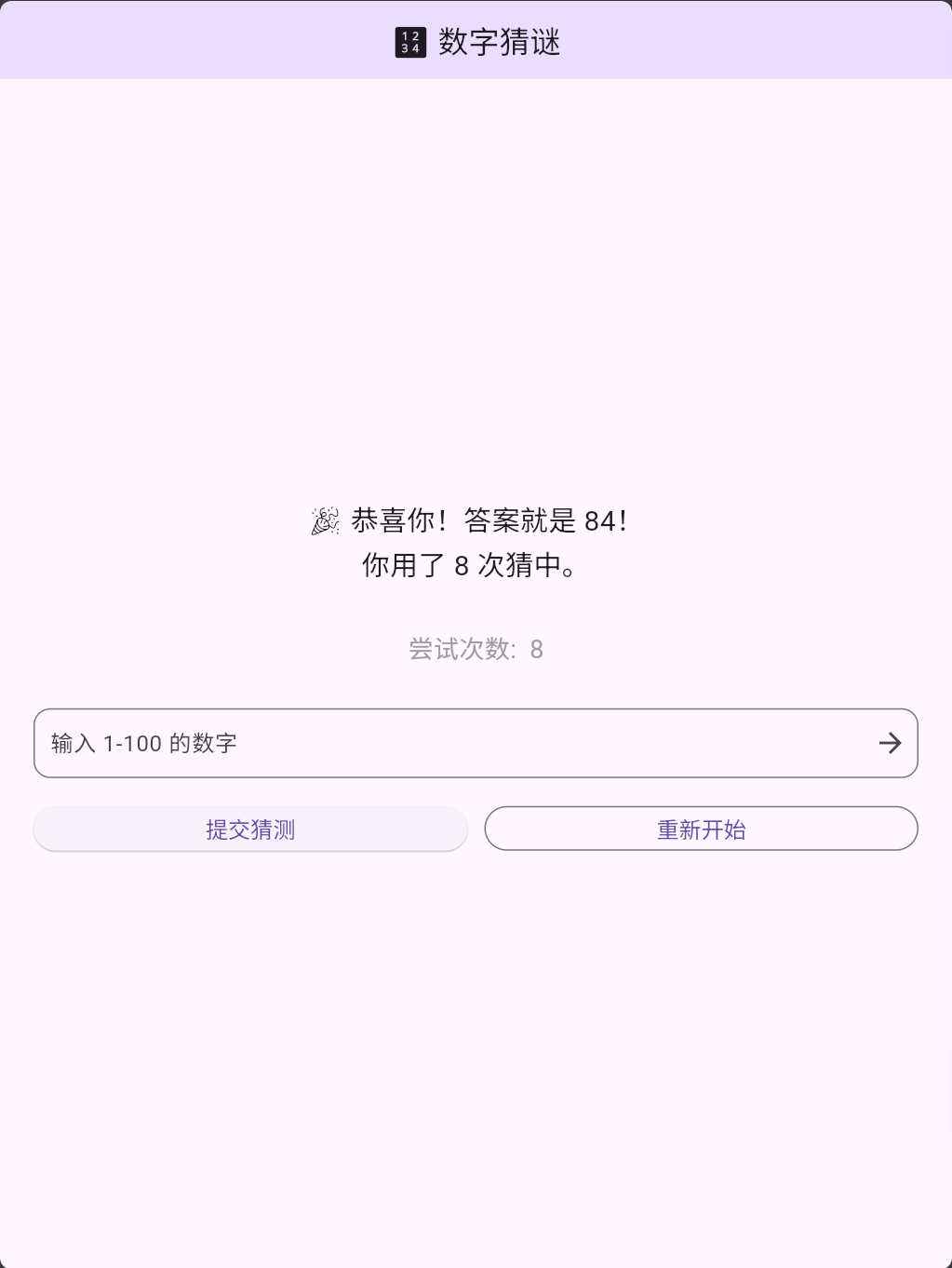 - 实时反馈机制:根据用户输入,动态提示"太大"、"太小"或"恭喜猜中"。