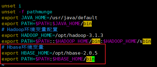 3、 四个节点:在/etc/profile中配置HBASE_HOME,并将HBase的bin目录添加到PATH中