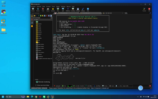 操作说明:在hadoop01节点终端中,启动Spark Python交互模式,执行测试代码验证核心计算功能。