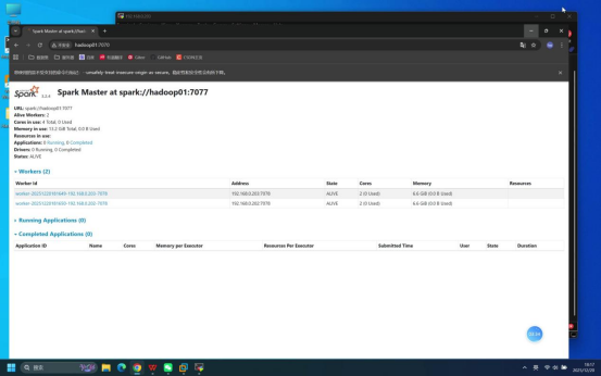 操作说明:在本地打开浏览器,访问Spark Master节点的Web管理页面,验证集群状态。