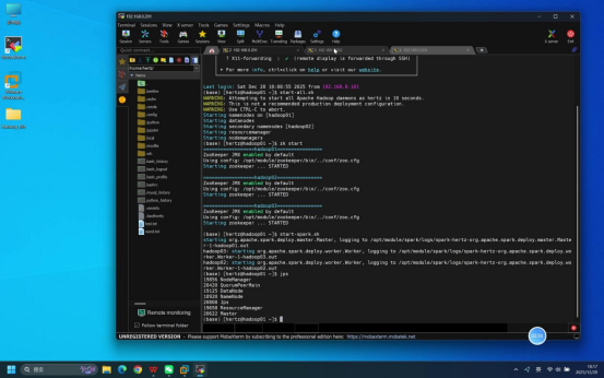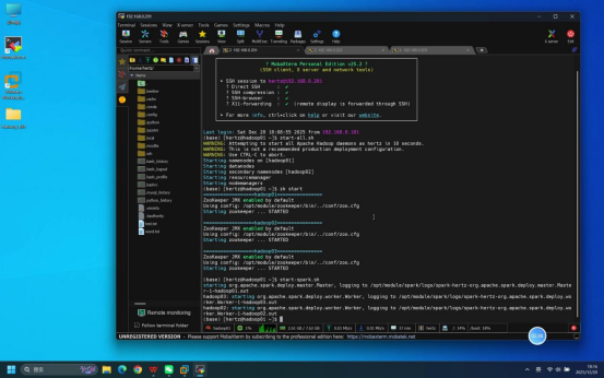 操作说明:在登录成功的hadoop01节点终端中,先确认依赖的Hadoop和ZooKeeper服务已正常运行,再执行Spark集群启动命令。