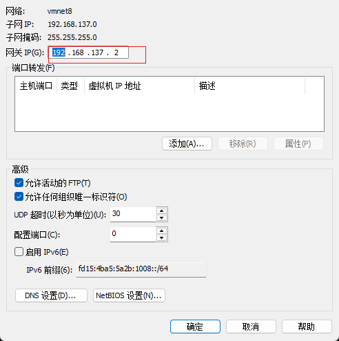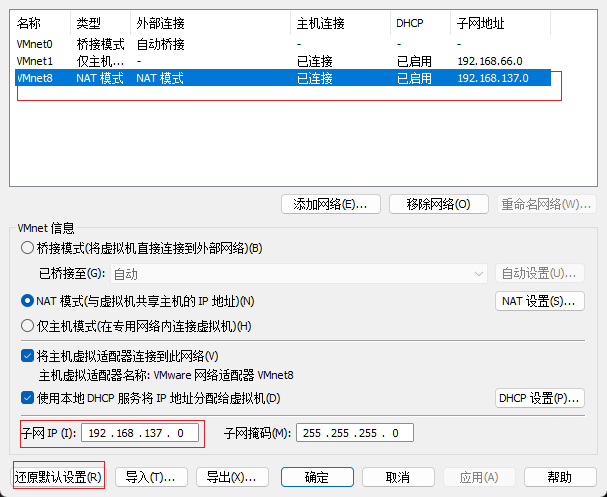 点击左下角"还原默认设置",等它完成。选中VMnet8,可见目前的子网ip
