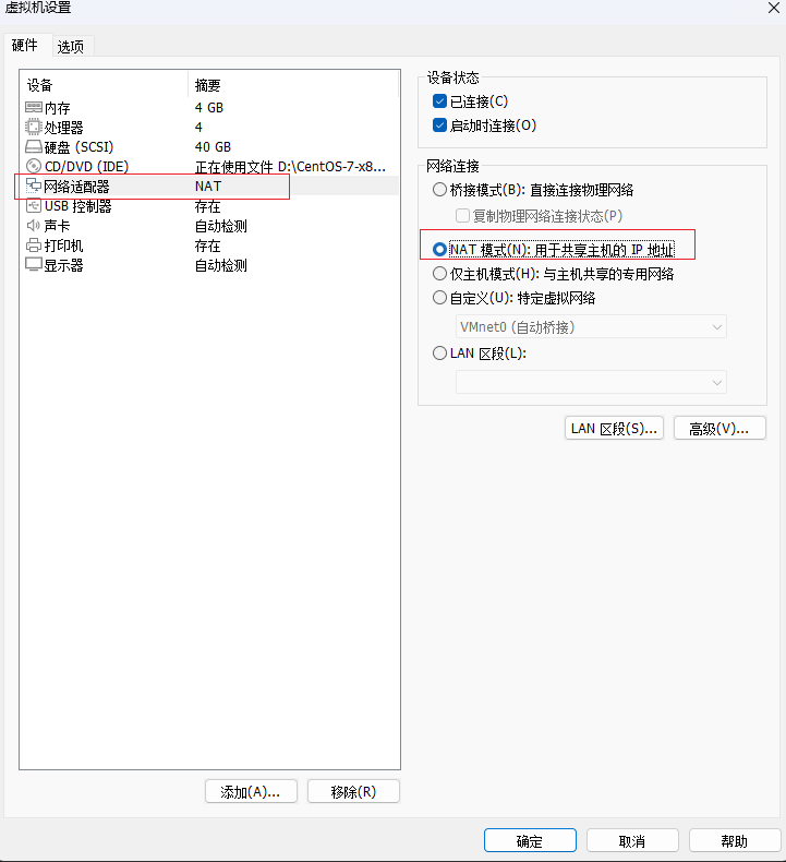 4 点击虚拟机设置-》网络配置-》选择NAT模式,确定
