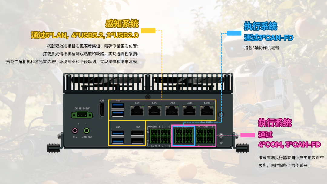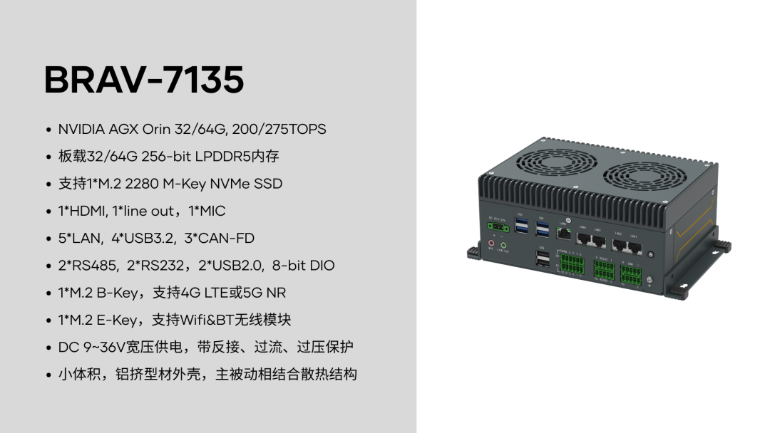 BRAV-7135高算力边缘控制器,能够满足智能采摘机器人严苛要求的高性能计算平台。凭借其强大的算力、丰富的接口和工业级的可靠性,BRAV-7135为智能采摘系统提供从环境感知、决策规划到精准控制的全流程边缘计算解决方案。