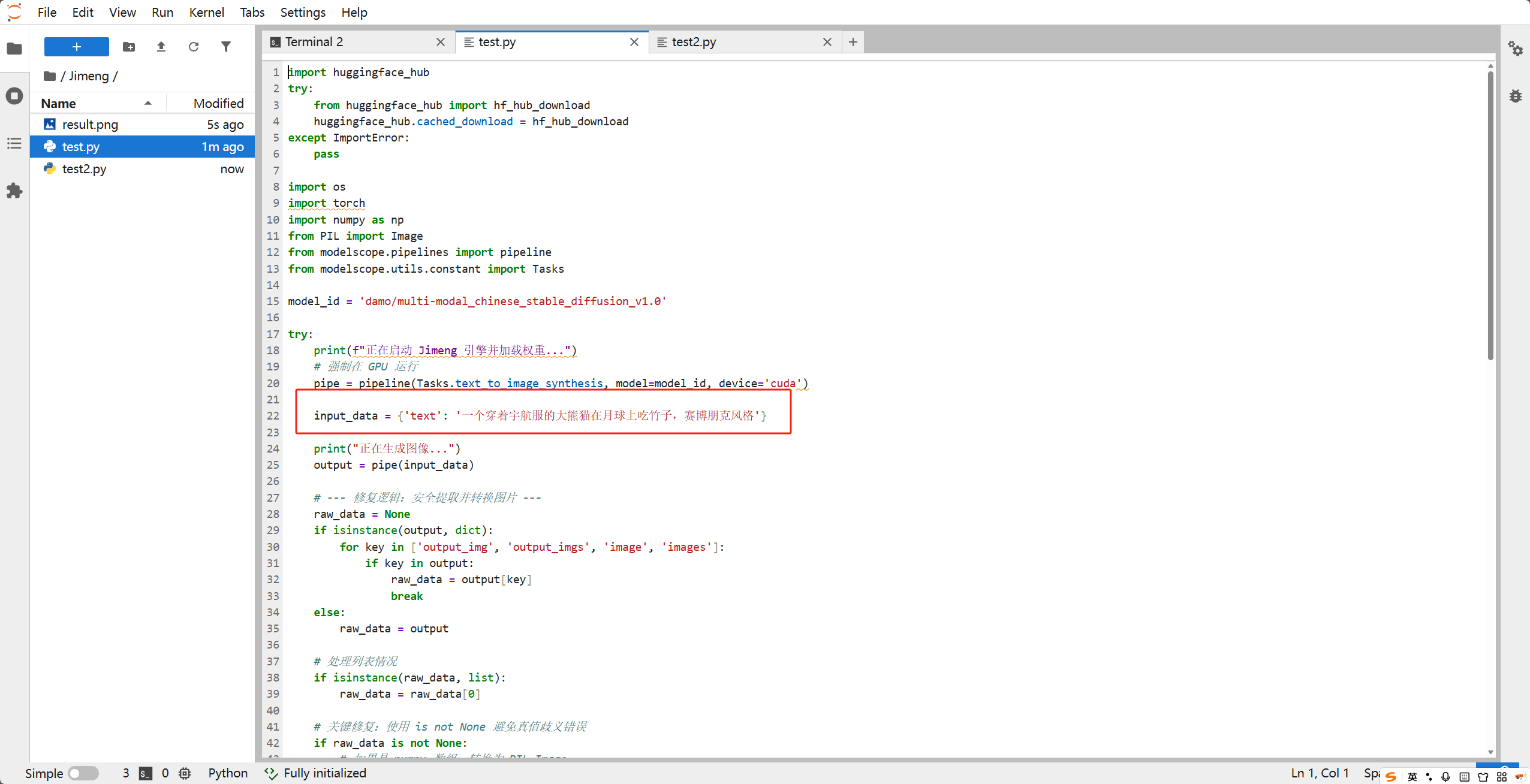 我们将创建一个名为 test_jimeng.py 的脚本。它不仅解决了兼容性问题,还支持一次加载模型、多次交互生成,并具备极强的代码健壮性。