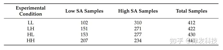 表 1 展示了不同实验条件下的高低 SA 样本数量分布。通过卡方检验(Chi-square test)分析发现:总检验结果显著:χ² = 45.571,p≤0.001;表明不同实验条件有效诱导了 SA 状态变化。