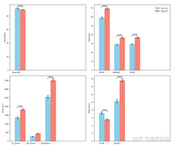 提取 9 个心率变异性(HRV)指标:时域指标:Mean HR、SDNN、RMSSD、SDSD、pNN50;频域指标:LF功率、HF功率、总功率、LF/HF比值。