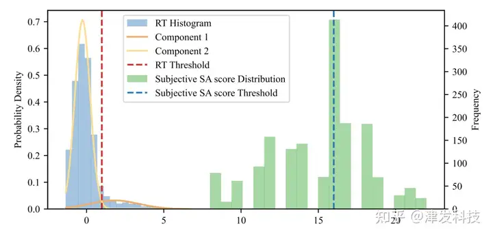 反应时间(RT);主观 SA 评分(Adapted MARS)。具体操作如下:将 RT 数据进行标准化处理;使用双组分高斯混合模型(GMM)对 RT 聚类,两个分布的概率密度交点被用作划分高低 SA 的阈值。该交点对应标准化值 0.99,实际 RT 为6.55 秒。