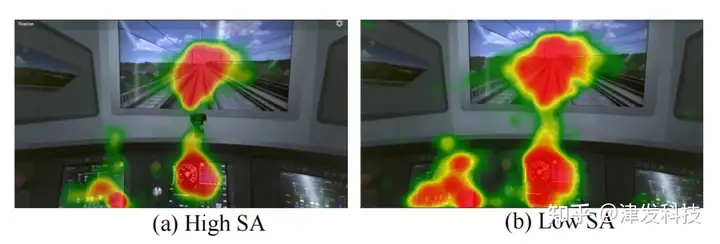 高 SA 状态下:受试者主要注视外部环境,仅偶尔查看仪表,说明其注意力集中、任务效率高;低 SA 状态下:注意力偏向仪表盘,忽视外部环境,提示其可能认知负荷高或疲劳加重;低 SA 状态下的"补偿性注视"虽频繁,但可能阻碍整体情景意识。
