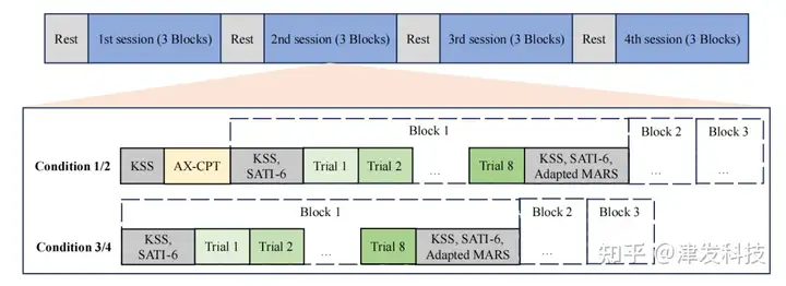 为评估受试者的心理状态,我们使用了以下三种主观量表:Karolinska 睡意量表(KSS):常用于评估疲劳,分为 1(非常清醒)到 9(非常困倦);状态焦虑问卷简版(SATI-6):6 项问卷,用于评估压力强度;任务意识评价量表(MARS):原用于飞行员的情景意识自评量表,在本研究中进行了适配以适用于列车驾驶任务(详见附录 A)。
