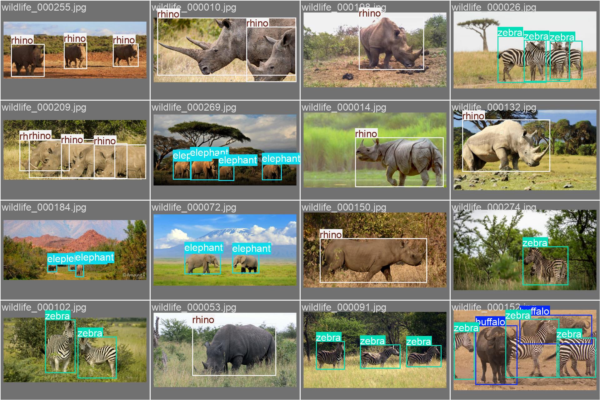 - 数据集介绍:野生动物检测数据集,真实场景高质量图片数据,涉及场景丰富,比如旱季水源地聚集、迁徙通道穿越、灌丛遮蔽行走、野生动物遮挡、野生动物严重遮挡数据等,且类别丰富,划分为 "buffalo"、"elephant"、"rhino"、"zebra" 四个类别;