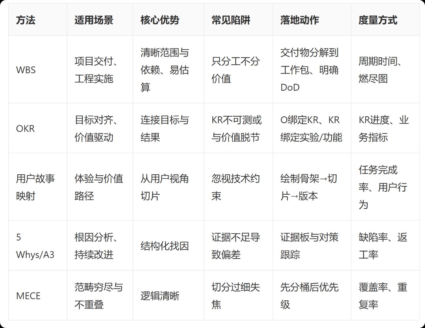 在工程与项目管理领域,WBS(工作分解结构)是经典工具,用于沿交付物维度逐层划分工作包。**按照PMBOK第七版(PMI,2021),WBS有助于明确范围、控制变更并提高可预测性,但需与价值与指标对齐,避免只分工不分价值。**在产品与增长问题上,OKR提供了目标与关键结果的对齐机制,用户故事映射则从用户价值流切入,把体验步骤变成可交付的故事与版本切片,两者结合能把"做什么"与"做到什么程度"同时落地。