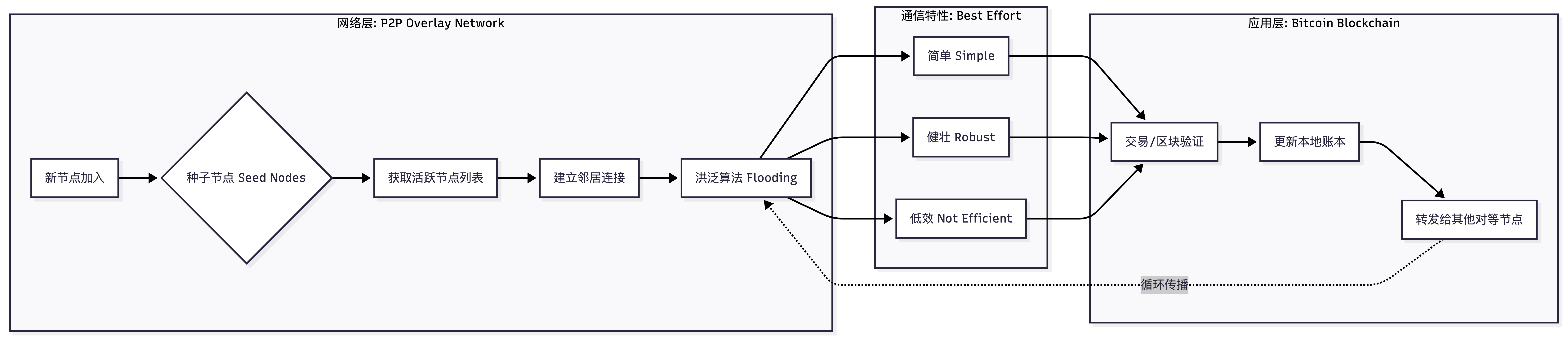 - Best Effort (尽力而为):由于 P2P 网络的复杂性,信息传递不保证 100% 成功,也不保证顺序。网络通过多次冗余传播,确保绝大多数节点最终都能同步数据。