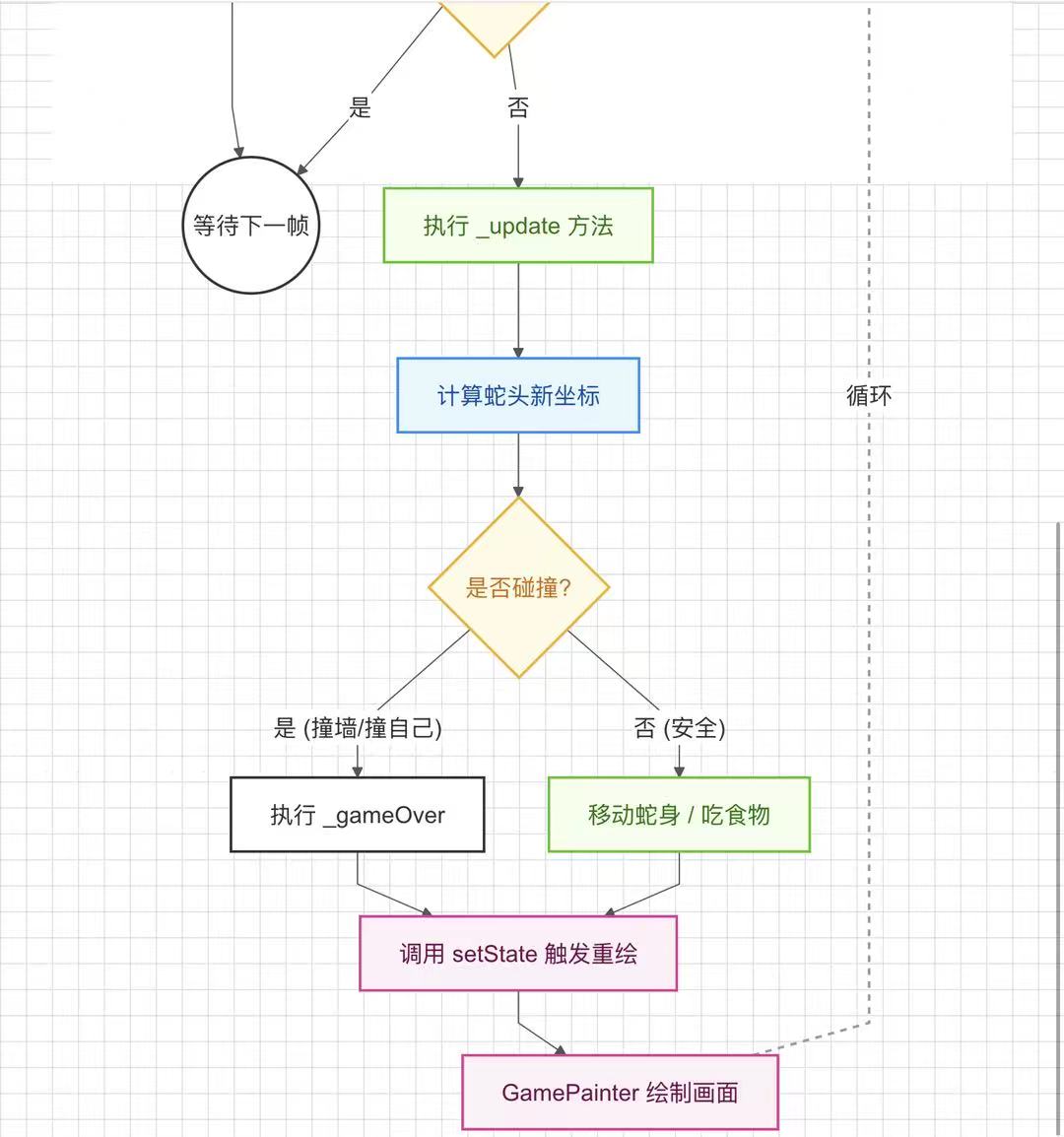 在贪吃蛇游戏中,蛇的移动是最核心的机制。本文将详细讲解如何在Flutter for OpenHarmony中实现蛇的自动移动,包括坐标系统设计、Timer定时器使用、方向控制算法以及防自杀机制。
