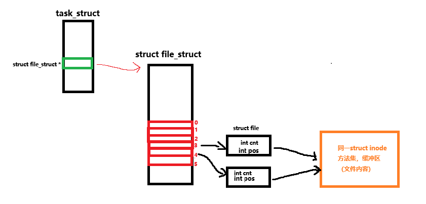struct file 是管理内存文件的结构,磁盘上是没有的,只会在内存中存在。 读方式和写方式两次打开文件时,因为 struct file 中读写位置 pos 是不同的,因此struct file 有两个,所以两个struct file*指向不同的struct file ,一个用来读取,一个写入,但他们会指向同一个方法集,inode 和文件缓冲区(内容)。