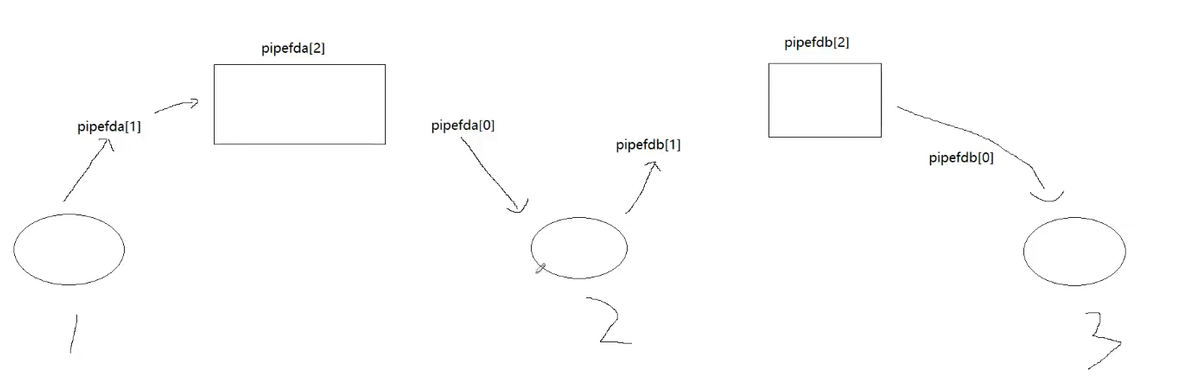 他们3个是兄弟进程,父进程都是bash,因为是兄弟间通信,管道是先创建的,所以3个子进程都能看到这两个管道,然后不同管道关闭不需要的读写端就行。
