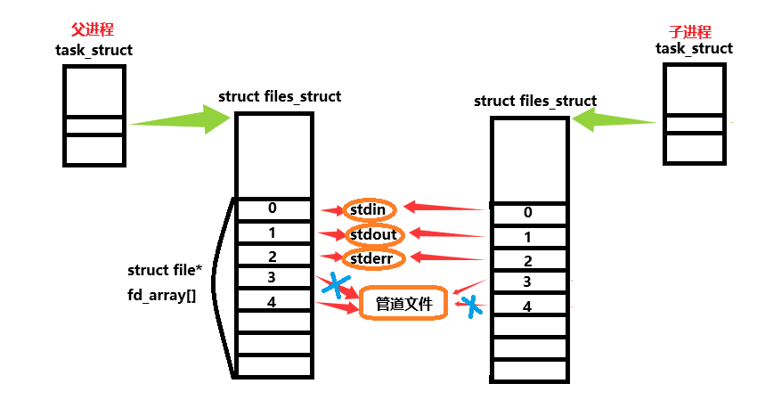 - 进程独立性与文件系统没有关系。因为父子进程指向同一个标准输出,所有才能打印到同一个显示器。文件描述符表也属于进程部分 ,也会拷贝过来,但不会直接拷贝文件。父进程创建子进程时,我们可以先创建一个文件,用两个文件描述符指向,文件描述符表浅拷贝struct file *, 普通文件也可以被父子进程同时看到,就可以完成进程间通信。但是这种方式内存中的文件缓冲区会刷新到磁盘中,而我们不需要,这时需要这个文件只是纯内存级文件,称为管道文件。