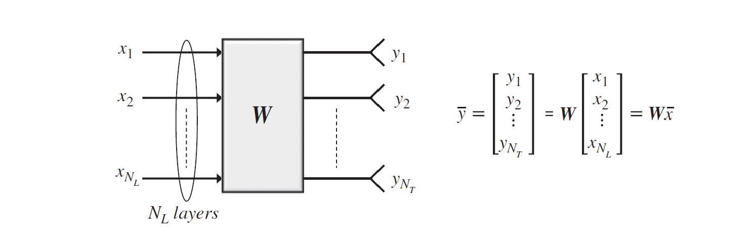 所有线性多天线传输方案均可采用上图的通用模型描述,其中 N L N_L NL层向量 x \bf{x} x通过 N T × N L N_T×N_L NT×NL维矩阵 W \bf{W} W映射至 N T N_T NT个发射天线(向量 y \bf{y} y)。虽然该模型适用于多数场景,但具体实现会受到不同约束条件的影响。关键实现问题在于多天线处理(矩阵 W \bf{W} W)在发射链路中的位置,主要存在两种方案: