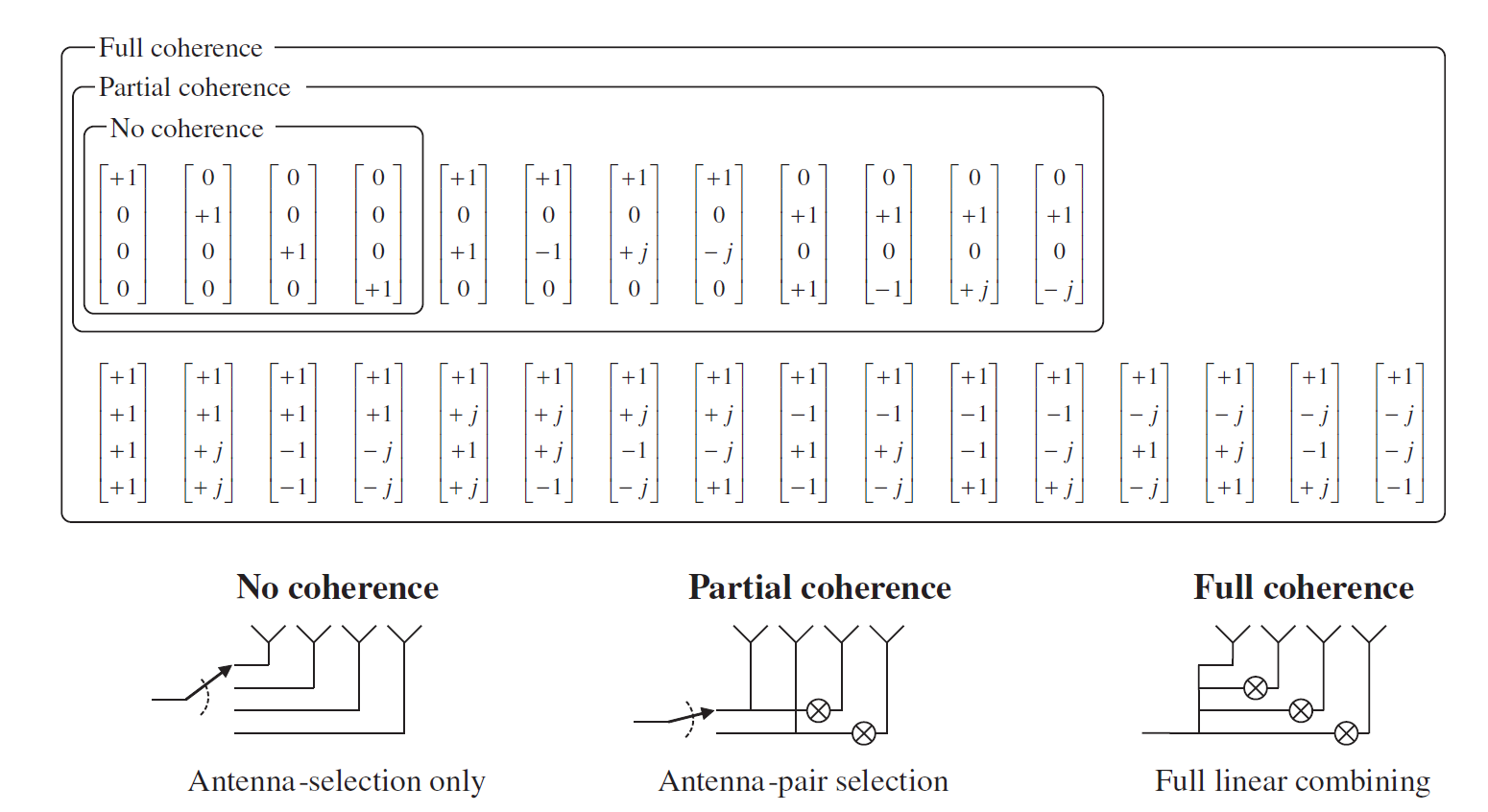 - 非相干终端在单秩传输时仅能使用前两个预编码矩阵(相当于天线端口选择)