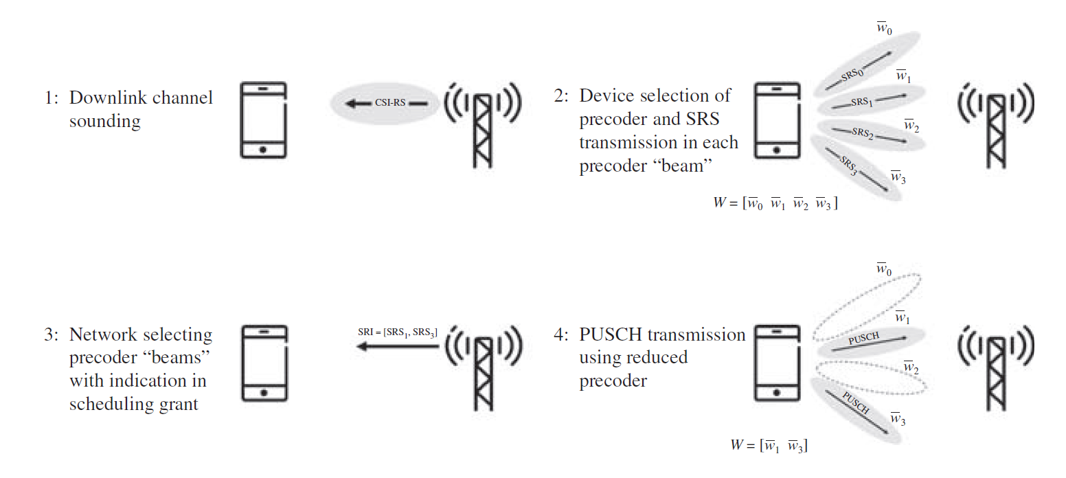 但需注意,设备对预编码器的选择并非完全自由。在基于码本的传输中,调度授权会包含预编码器信息,类似于下行链路中设备提供的PMI。不同的是,上行链路中设备必须使用网络指定的预编码器。即使在非码本传输中,网络仍会对预编码器的最终选择施加影响。