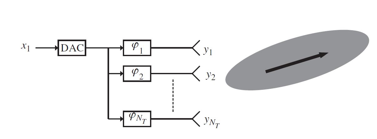 数字方案的主要缺点是复杂度高,特别是需要为每个天线单元配备独立的数模转换器。对于高频段大规模天线阵列,模拟处理方案(上图左侧)在中短期内更具优势,此时多天线传输主要实现波束赋形功能(见下图)。
