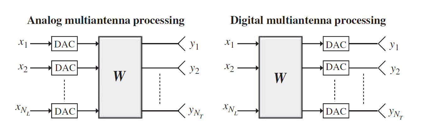 当采用数字处理(或更灵活的天线权重控制)时,传输矩阵 W \bf{W} W通常称为预编码矩阵,相应的多天线处理技术则称为多天线预编码。