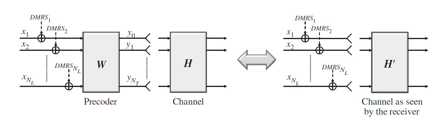 另一种情况是,当参考信号与数据信号一起经过预编码处理后,从接收端的角度来看,预编码过程可以被视为整体多维信道的一部分(如上图所示)。此时,接收端感知到的不是原始的 N R × N T N_R×N_T NR×NT维度信道矩阵 H \bf{H} H,而是经过发射端预编码矩阵 W \bf{W} W处理后的 N R × N L N_R×N_L NR×NL维度等效信道 H ′ \bf{H'} H′。这种机制使得预编码过程对接收端透明,意味着发射端可以自由选择预编码矩阵,而无需向接收端告知具体的预编码器信息。