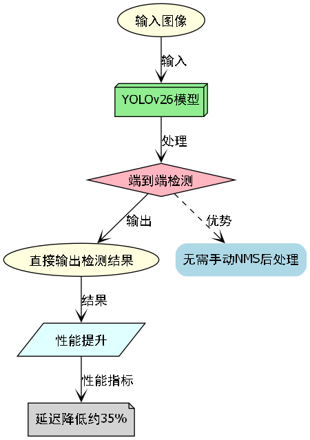 端到端无NMS推理:传统YOLO算法需要使用非极大值抑制(NMS)来消除重复检测框,而YOLOv26通过改进的网络结构,可以直接输出最终检测结果,省去了NMS步骤,显著提升了推理速度。