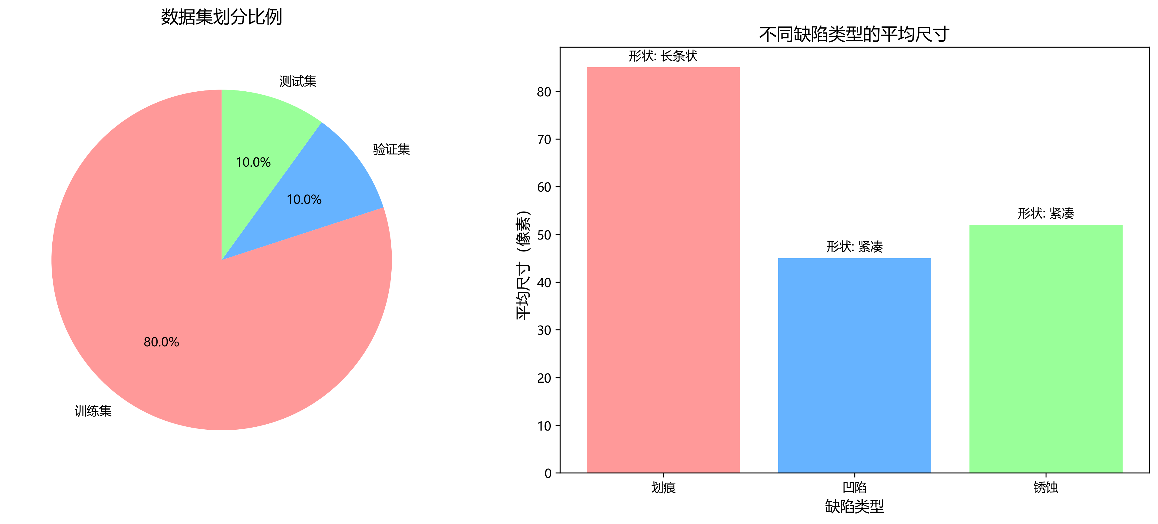 | 缺陷类型 | 训练集数量 | 验证集数量 | 测试集数量 | 平均尺寸(像素) |