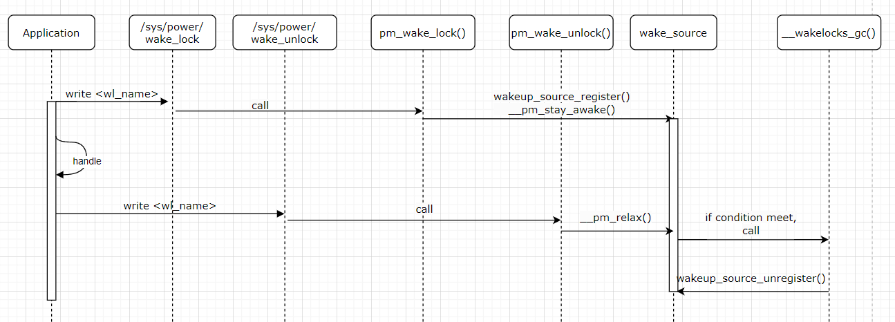 - 应用程序在处理完数据后允许系统进入休眠状态时,通过向/sys/power/wake_unlock写入已持锁的wakelock名字,此时pm_wake_unlock()被调用