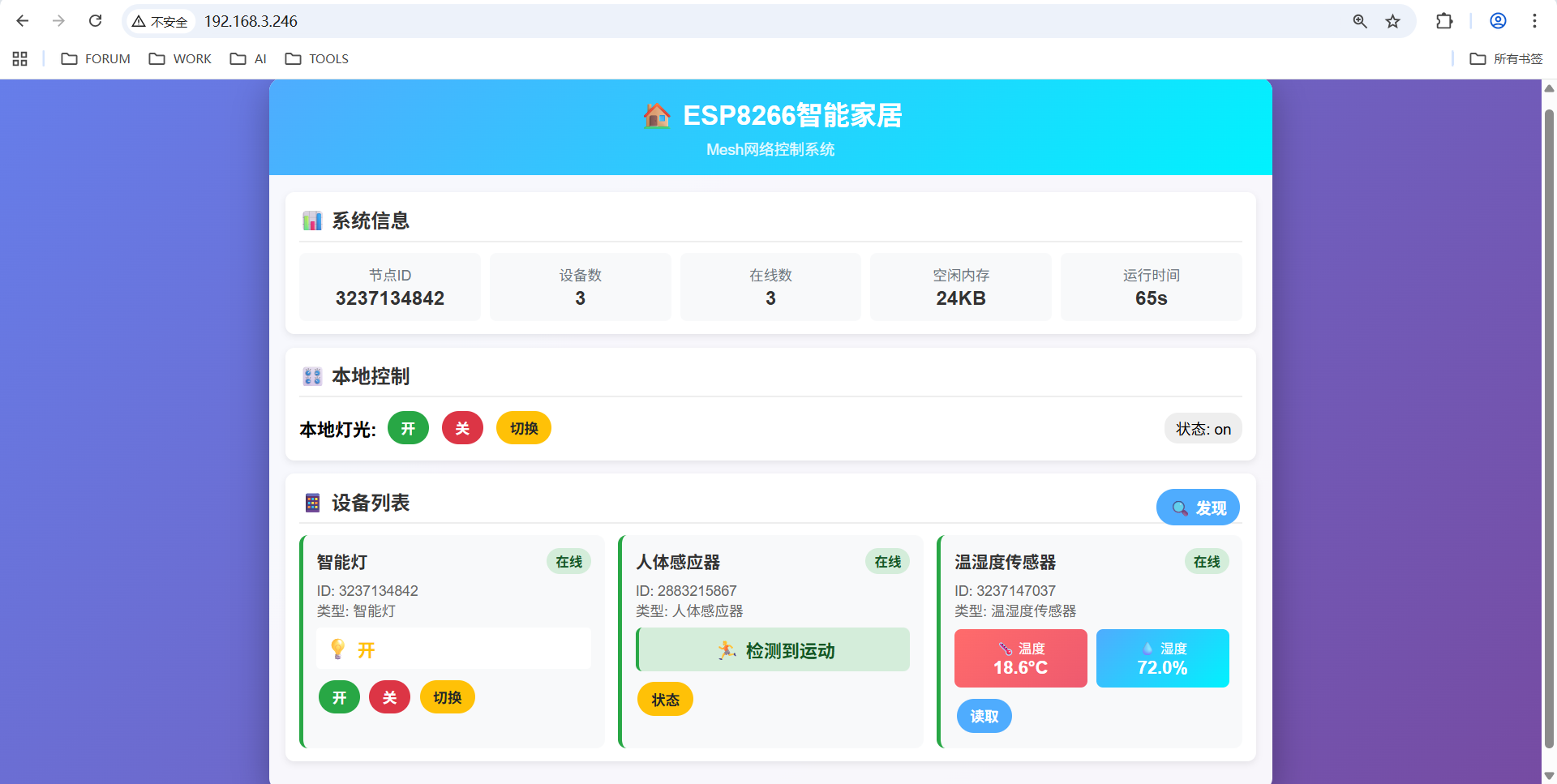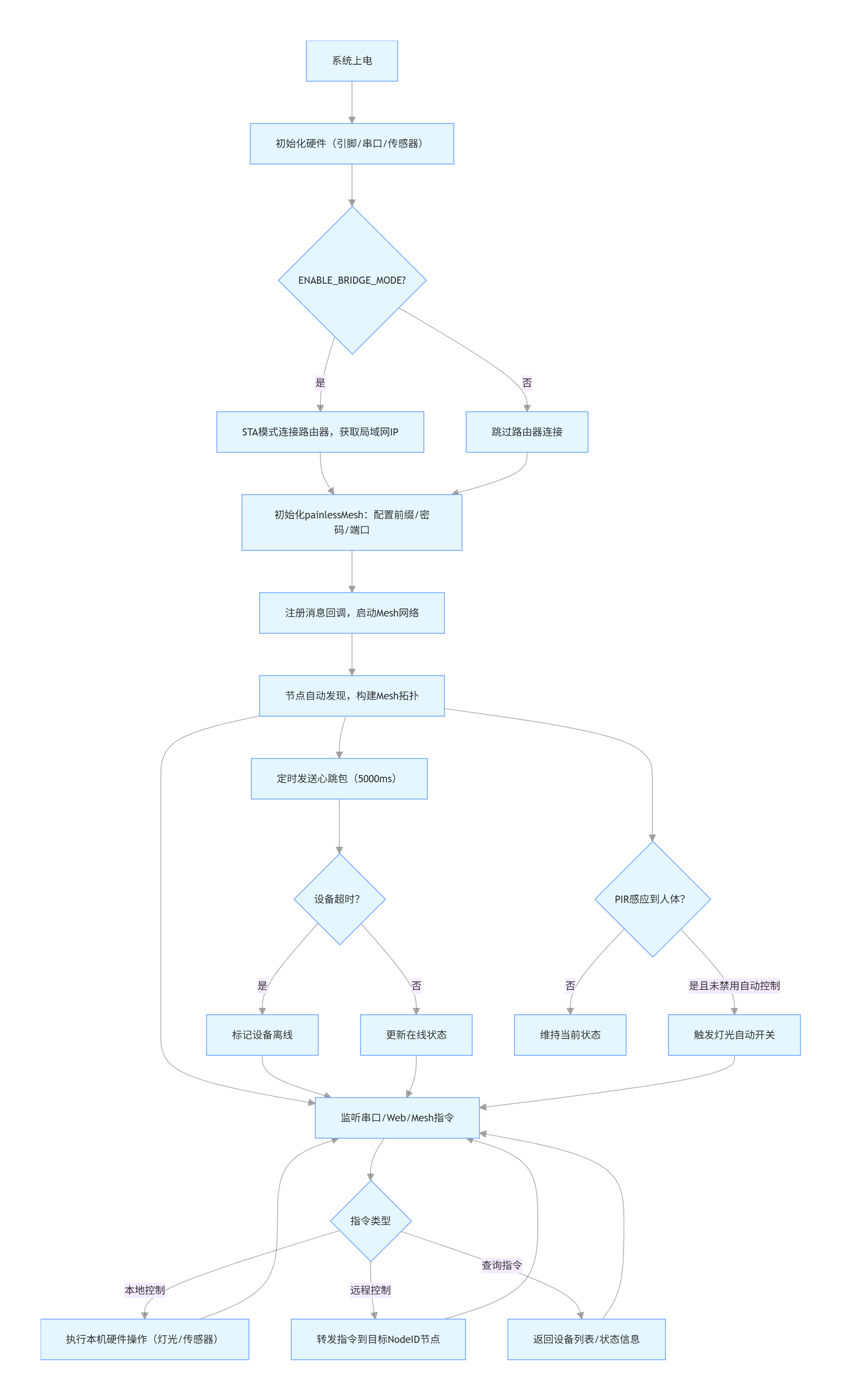 painlessMesh库实现 ESP-MESH 无线自组网,构建去中心化的智能家居控制系统。核心围绕 MESH 组网技术,打通多设备间的无线通信链路,支持三种设备类型的灵活部署,兼顾实用性与扩展性