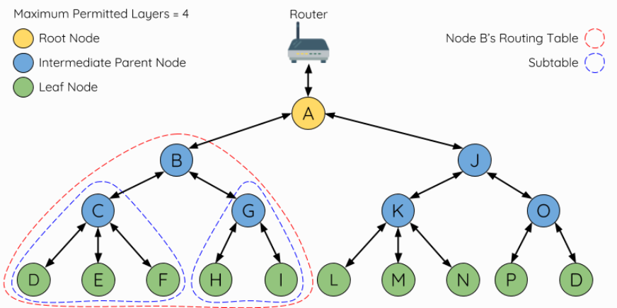 具有最强的路由器 RSSI 值作为信标帧将在整个网络中传播,经过多次传输和扫描迭代成为根节点