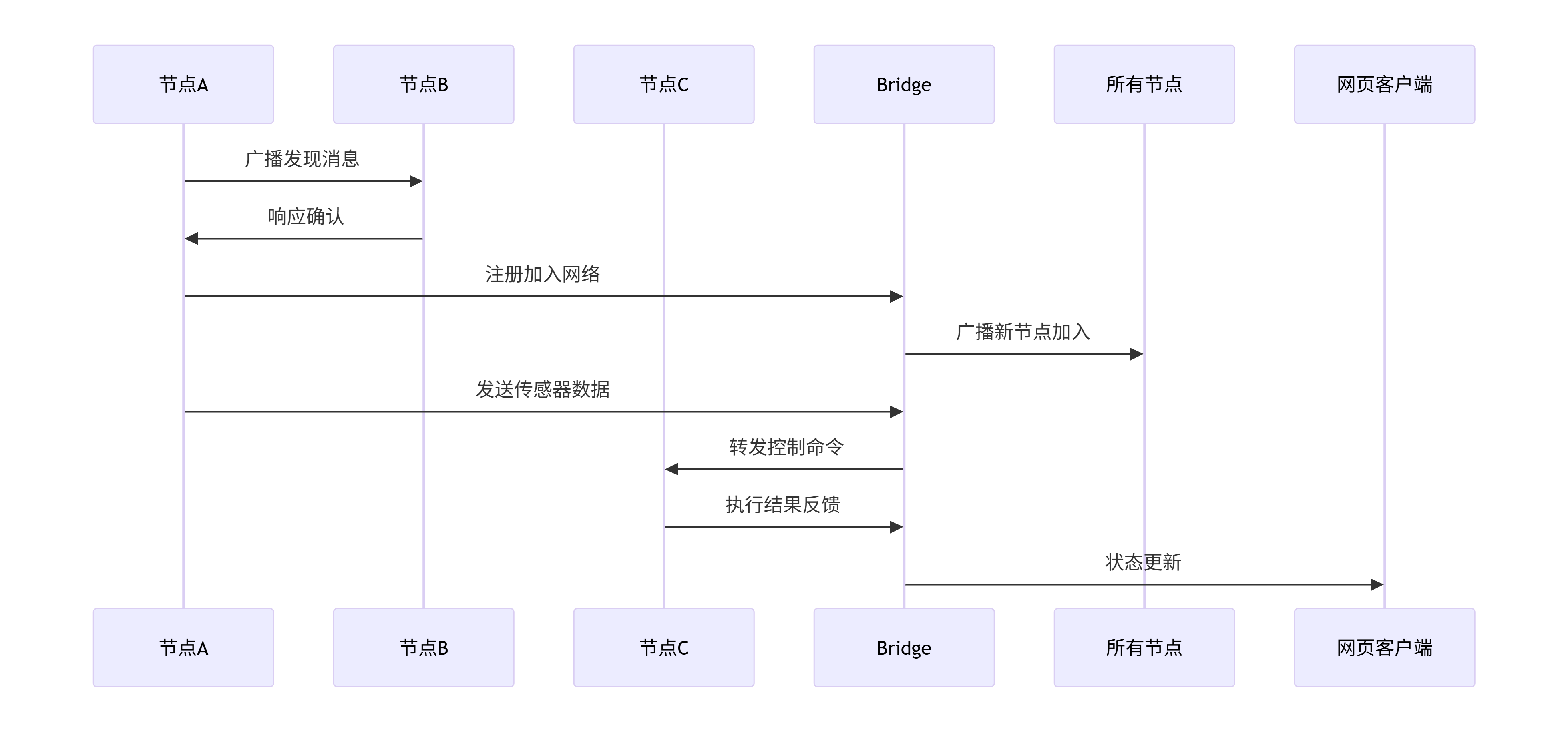 HEARTBEAT_INTERVAL=5000ms广播状态包,Bridge 节点维护 "在线节点列表",超过DEVICE_TIMEOUT=30000ms未收到心跳则标记离线