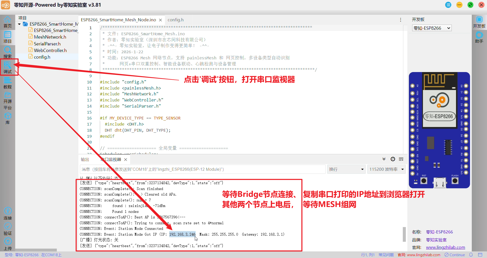 本视频完整演示基于零知 ESP8266(ESP-12F)的 MESH 组网智能家居系统,包含 Bridge 节点配置、Mesh 自动组网、串口 / Web 双端控制、传感器数据采集、人体感应自动化等核心功能,直观展示 ESP-MESH 自组网的稳定性与实用性