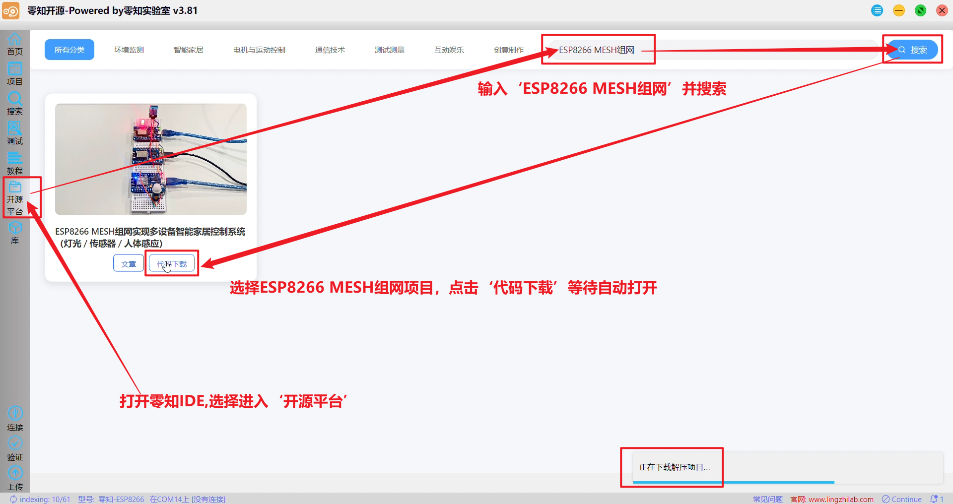2.1 开源平台-输入"ESP8266 MESH组网"并搜索-代码下载自动打开